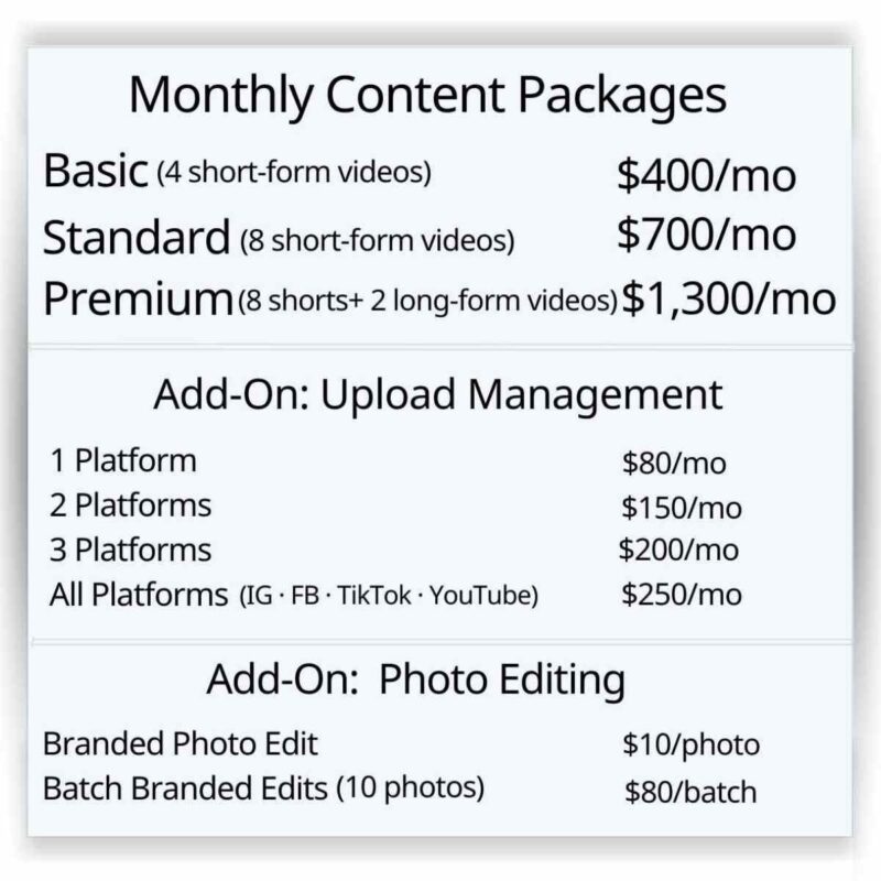 While one-time projects are available, most clients work with us on a monthly or ongoing basis to maintain consistency, performance, and brand alignment across platforms.